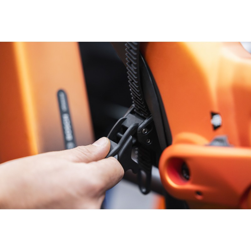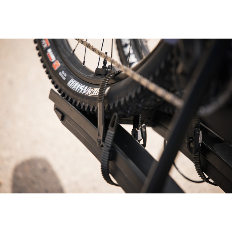 Sujeción de las bicis con correas dentadas con cierre de abrazadera. Correas extralargas para neumáticos anchos.